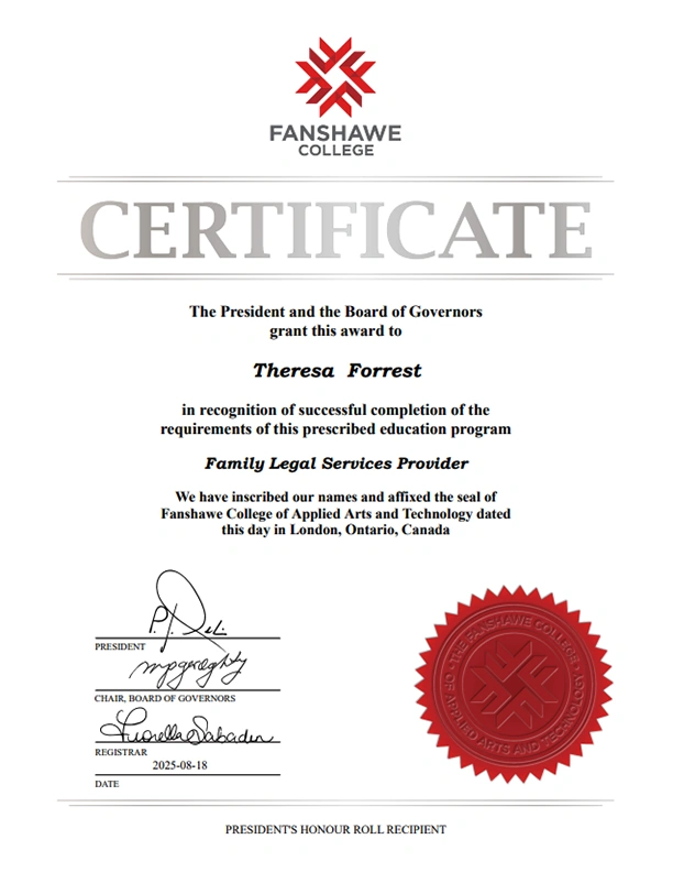 Theresa Forrest has successfully completed the Family Legal Services Provider (FLSP) program through Fanshawe College of Applied Arts and Technology, earning formal recognition for her achievement.